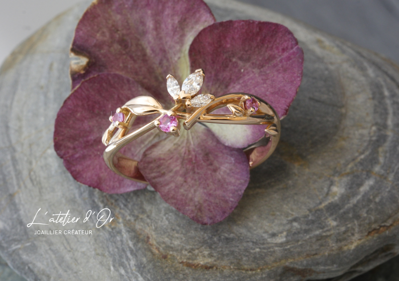 Il s'agit ici d'une alliance en or éthique, de l'or recyclé 18 carats, avec une inspiration nature et plutôt florale, très tendance.
