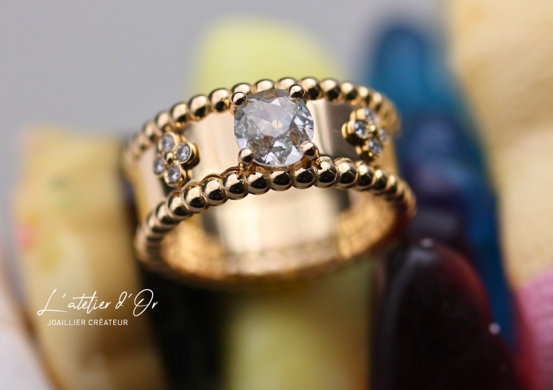 Pour accompagner ce diamant central, nous avons imaginé une structure en or jaune recyclé 18 carats, façonnée à la main dans notre atelier. Tout autour du plateau central, un délicat effet perlé vient encadrer la pierre, comme une dentelle de lumière. Ce motif, à la fois raffiné et structuré, évoque les bijoux anciens tout en affirmant une esthétique résolument contemporaine.